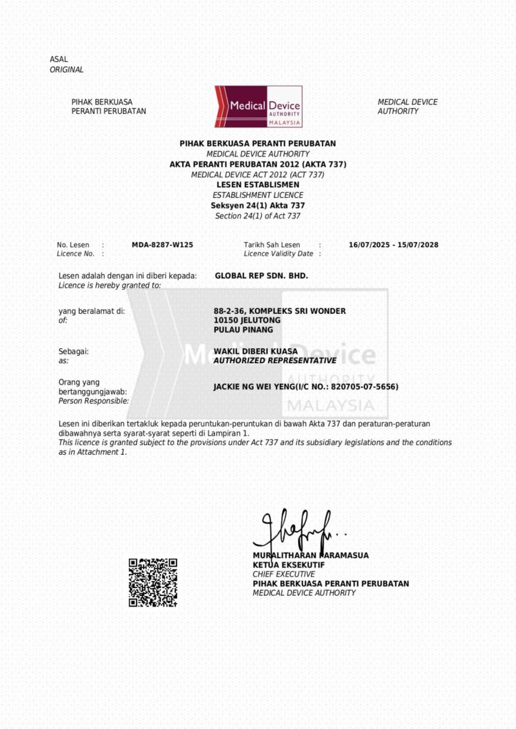 Founded in 2019, Global Rep serves as a trusted partner for foreign medical device manufacturers and local establishments, guiding them through Malaysia’s complex regulatory landscape. With GDPMD and ISO 13485 certifications, and licensing from the Medical Device Authority (MDA), we ensure compliance and quality. Our presence extends to ASEAN countries, supporting an international client base across the US, Europe, UK, Japan, China, Taiwan, India and more.
