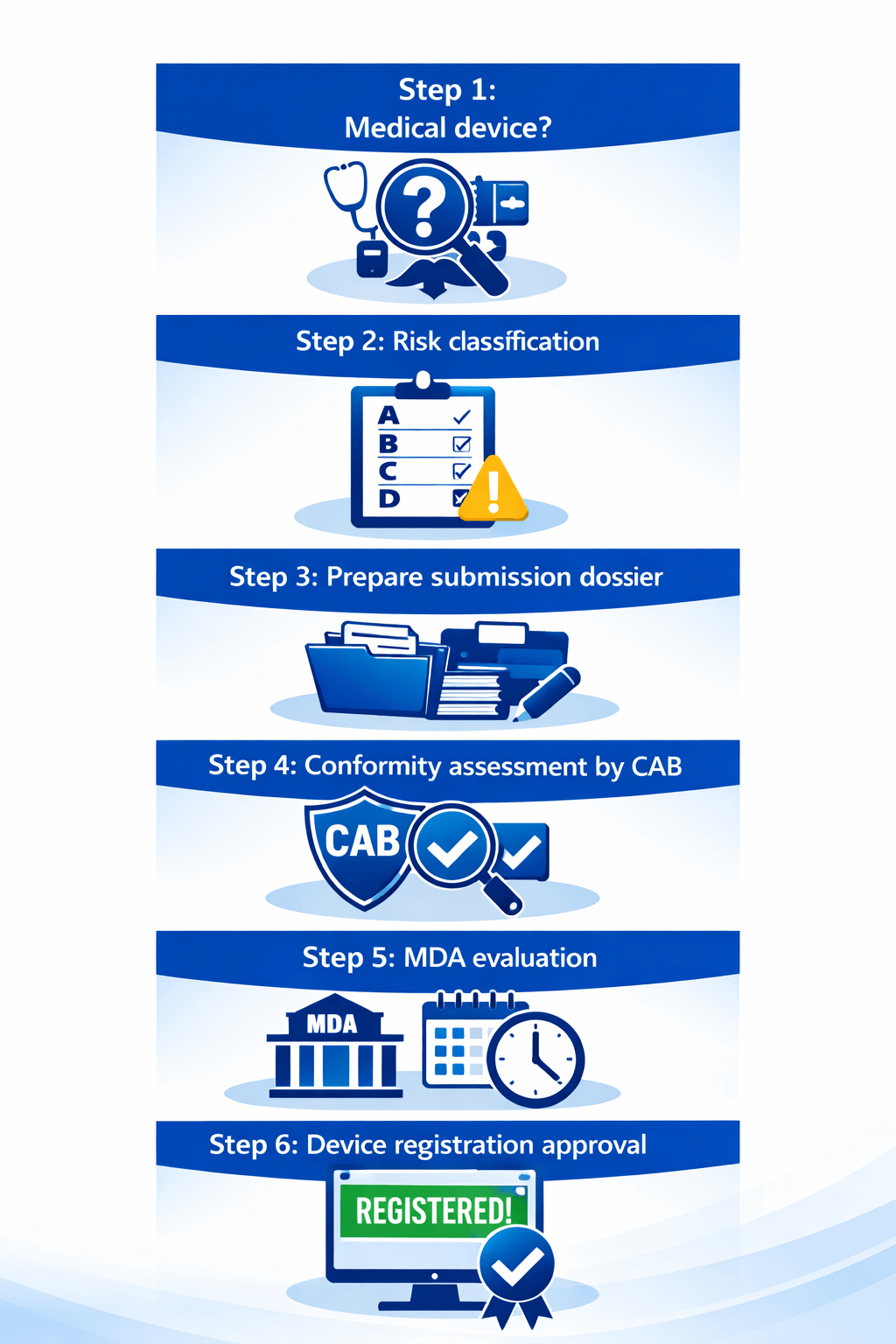 Upon successful evaluation, the MDA issues registration approval. The device is then legally permitted to be marketed and distributed in Malaysia.